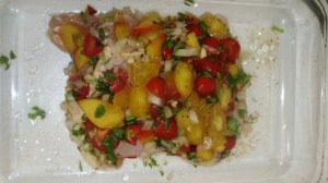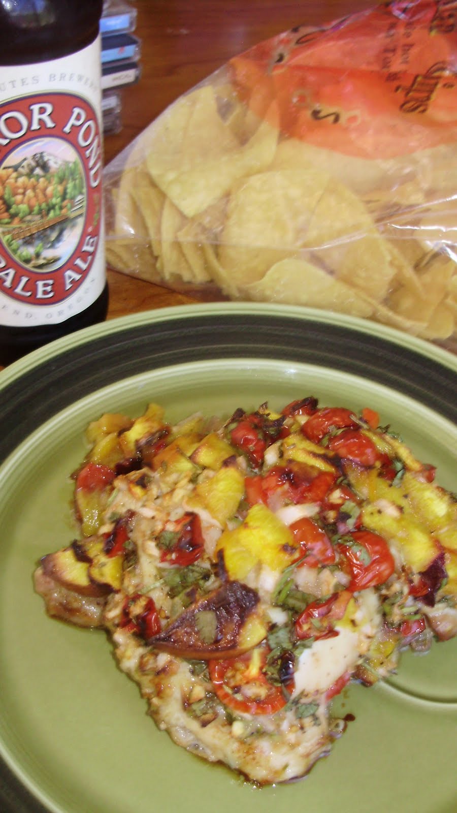 Preheat the oven to 400. Put a little bit of oil in a glass baking pan – so the chicken won’t stick. Place the chicken in the pan, spread as evenly as possible. Sprinkle with salt, pepper, and granulated garlic. Spoon some of the salsa on top of the chicken. Dice up the nectarines and add them to the salsa on top of the chicken. Spread the nectarines and salsa out so that the chicken in completely covered. Kind of press everything together so it will stick. Anything that falls off into the pan should be scooped back on top or tucked under the chicken pieces. (I suppose that last part is easier when you’re using a boneless piece of chicken…) Bake until the chicken is done (180). Enjoy – preferably with a cold beer and some more chips!