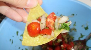 I made some great fresh salsa earlier – because really… what is better then fresh salsa and crispy tortilla chips for a mid afternoon snack? For my salsa I quartered cherry tomatoes, finely diced part of a white onion, very finely chopped three garlic cloves, and chopped a large handful of cilantro leaves. I threw everything together in a handy bowl and sprinkled in some sea salt and ground pepper. Voila! Salsa!