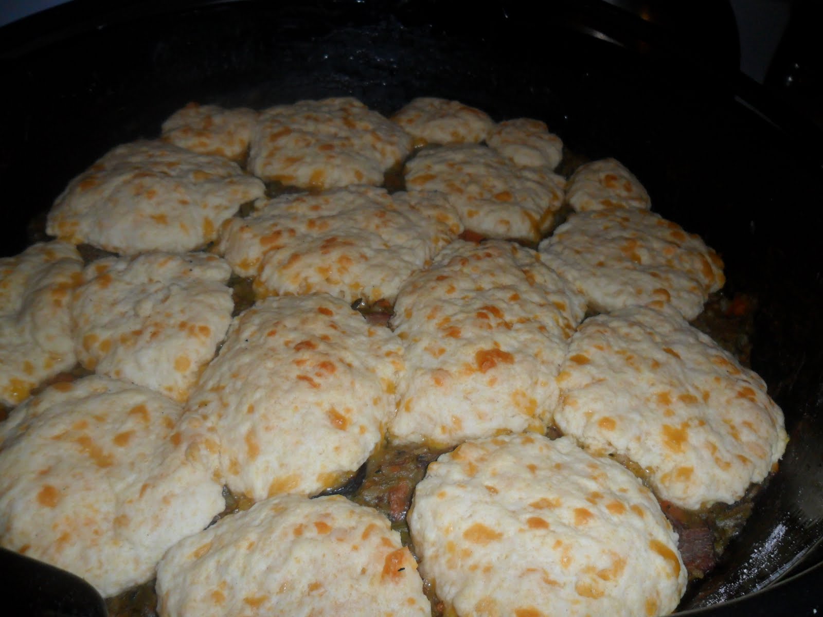 For dinner tonight I just thickened up last nights beef stew by throwing in a couple handfuls of flour as I reheated it. Then I made some easy cheddar biscuits that I baked in a dutch oven on top of my beef “stew” – to create an instant… Beef Pot-Pie!